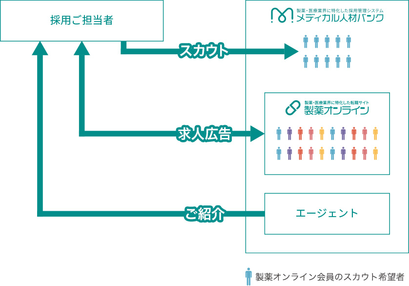 メディカル人材バンクが連携している製薬・医療業界に特化した転職サイト「製薬オンライン」では会員登録者の大半が業界の勤務経験者です。さらに、20〜60代まで幅広い層が将来的に製薬・医療業界での転職を考えています。こちらのデータベースと連携することにより求めている専門性の高い人材へ的確なアプローチが可能となります。